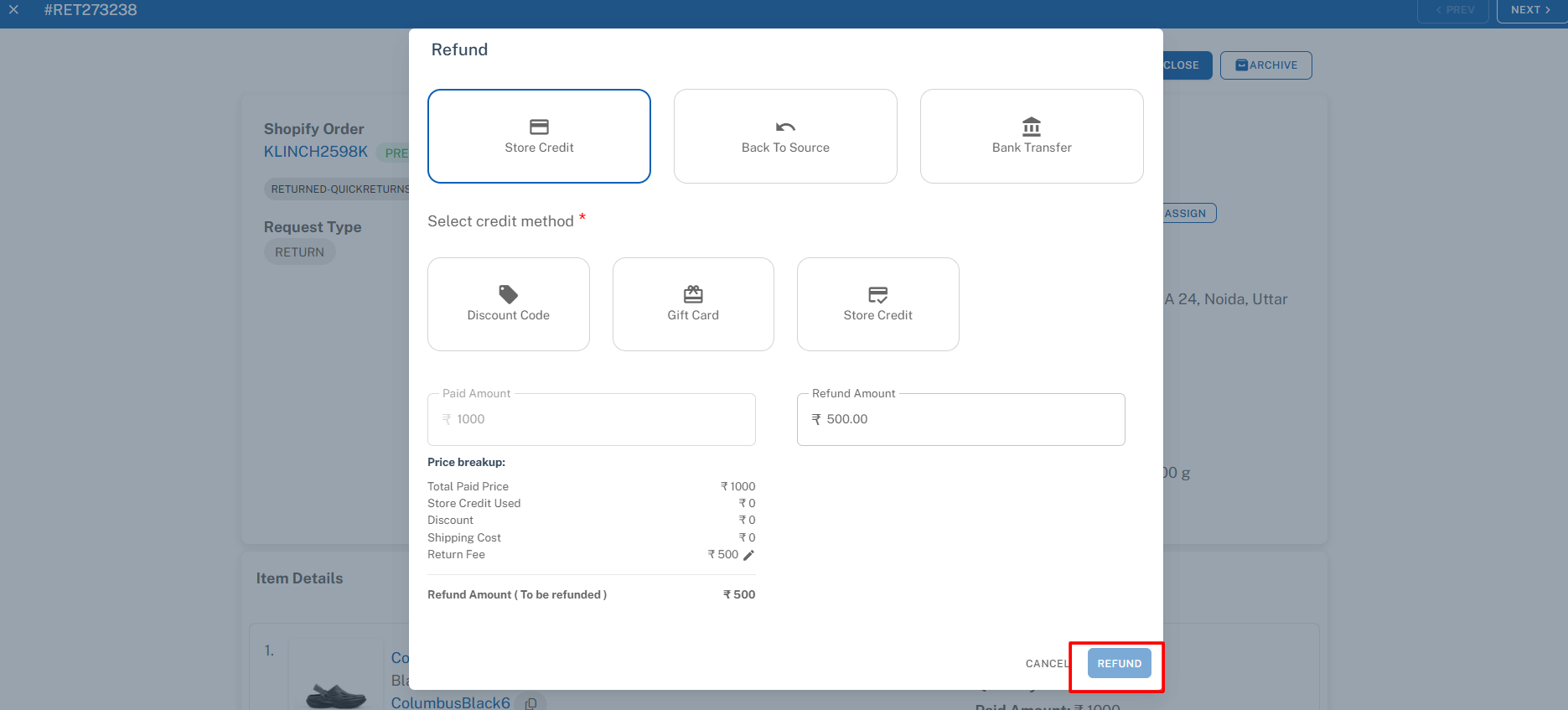Click on the Refund button. A pop-up will appear where you can choose the refund mode:- Store Credit – Discount Code