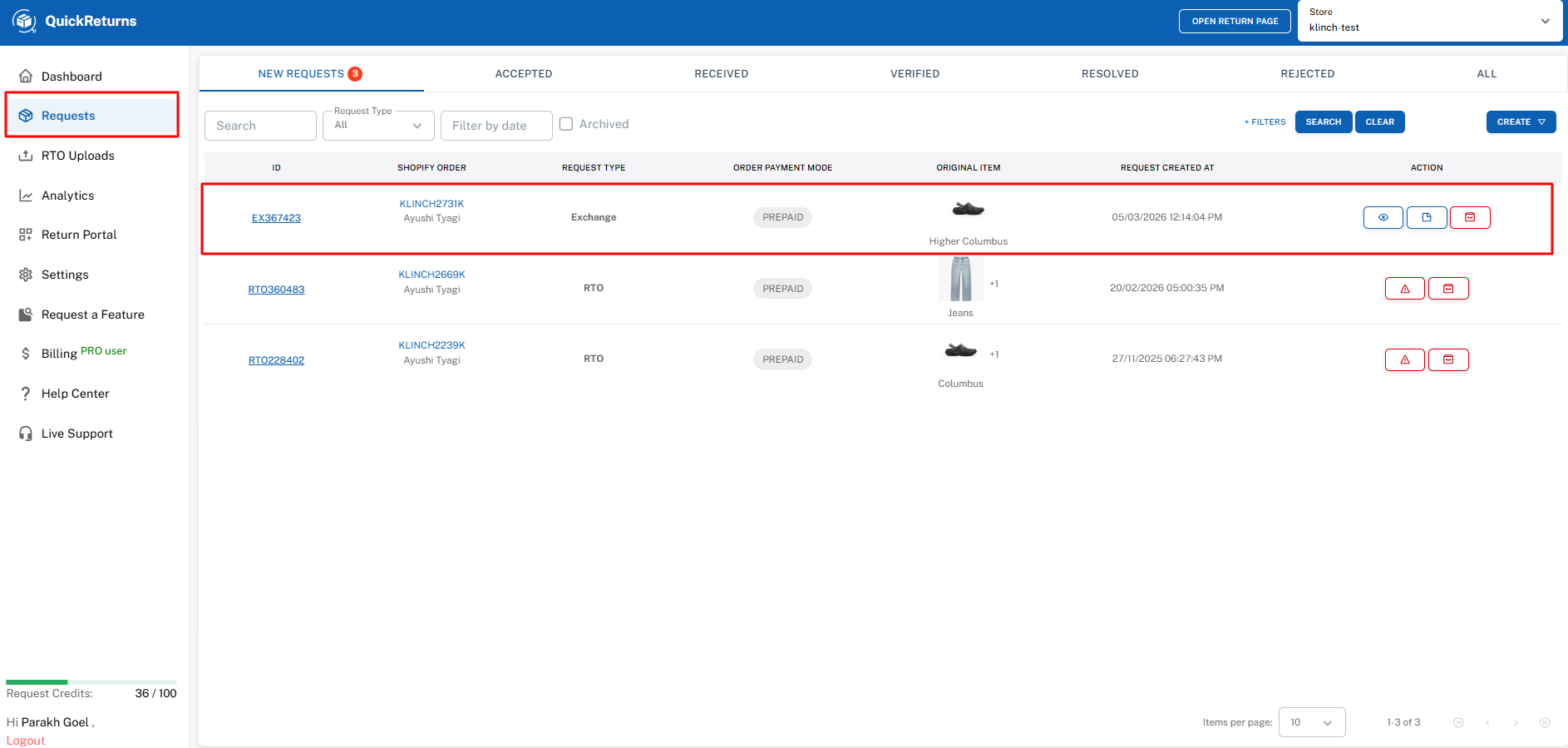 Step 4: Once the request is successfully submitted, go to the QuickReturns Portal and click on the Requests tab.