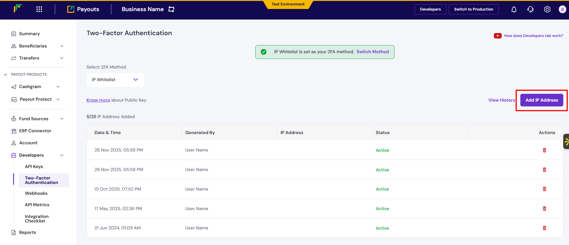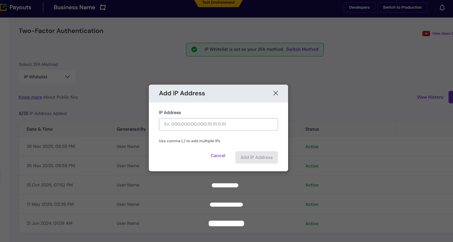 - Test Mode: A simulation mode that you can use to test your integration flow. Your customers will not be able to make payments in this mode.