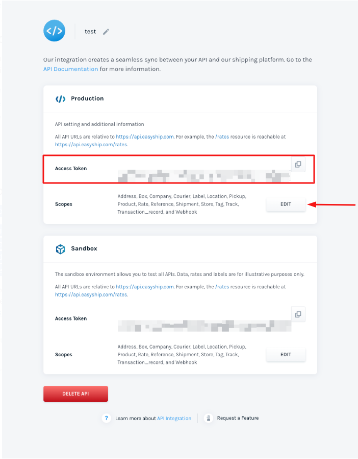 In the Production section, copy the API Access token, and you can see what scopes the token has access to.