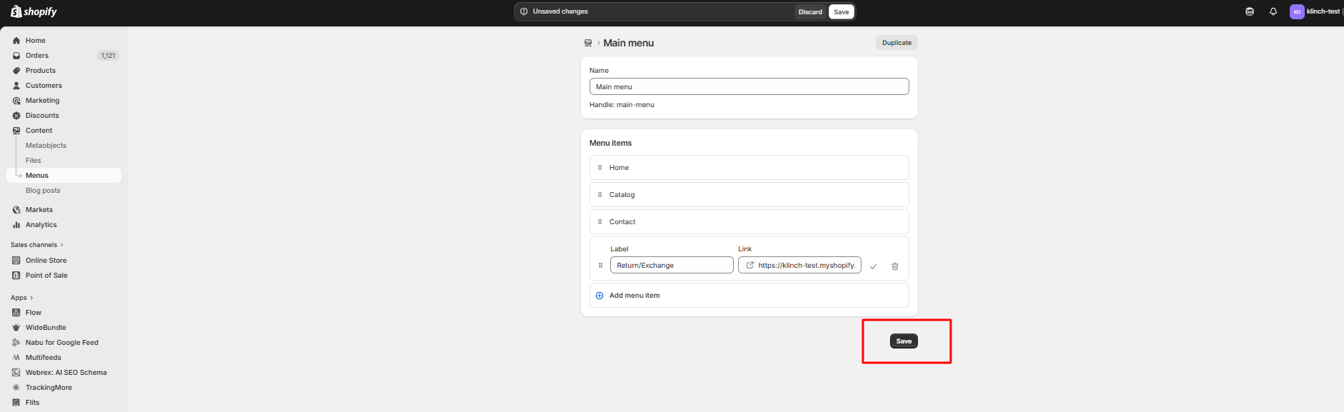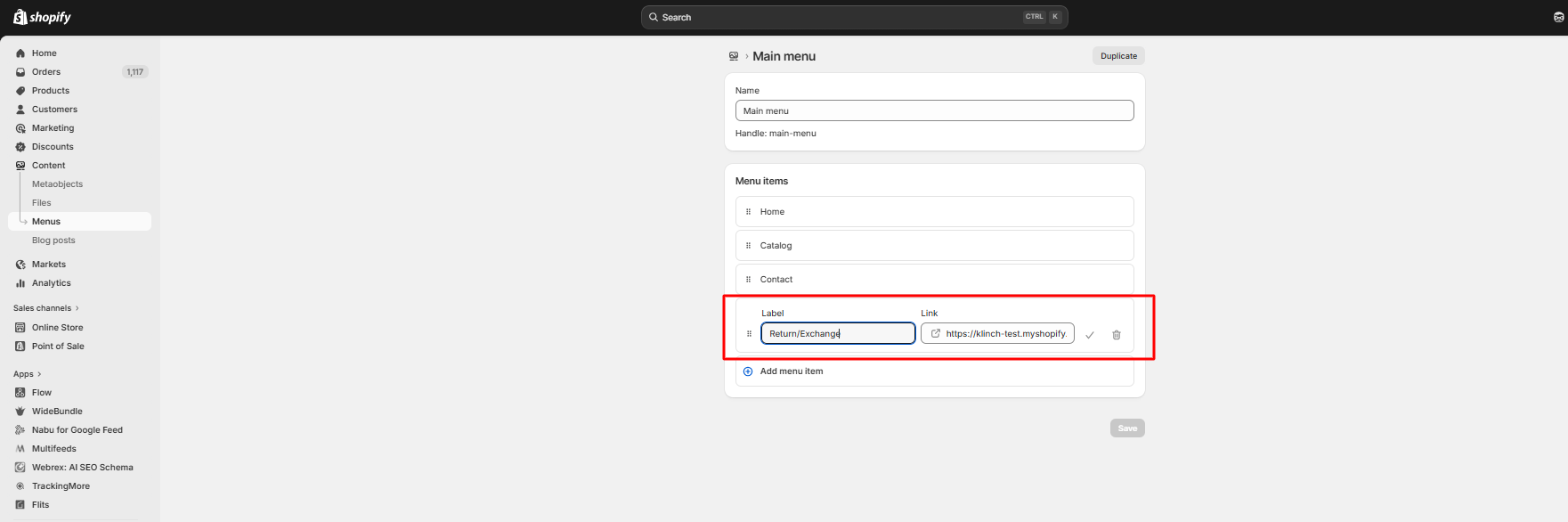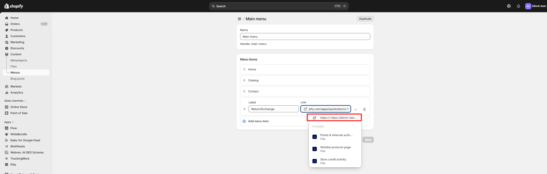 Step 3: In the Name field, enter a page name, such as Returns, Return Requests, or Request and Exchange. In the Link field, paste the QuickReturns URL that you copied earlier.