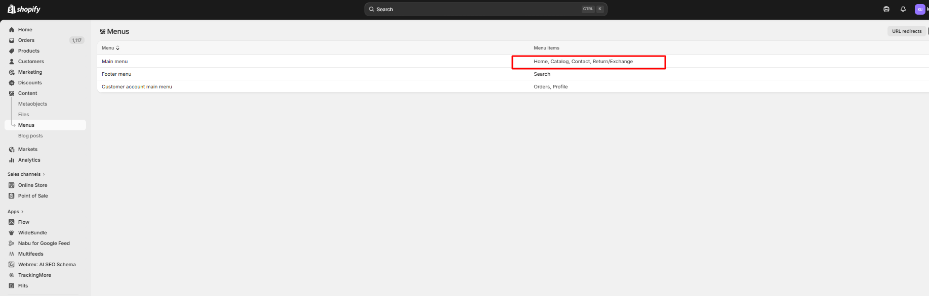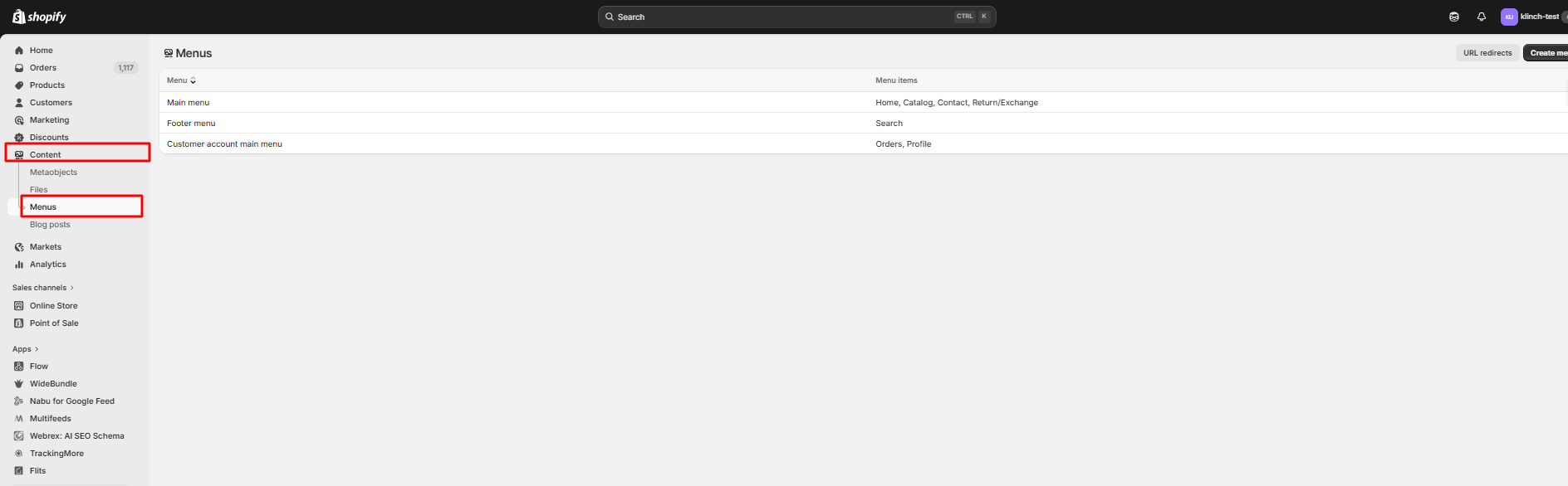 Step 1: Log in to your Shopify Store, navigate the Content tab from the Left Menu bar, and click on "Menu"